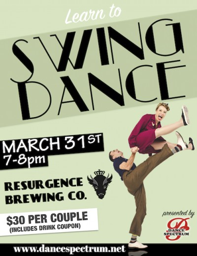 Join us after happy hour for a Swing Dance Lesson at Resurgence Brewing Co. No experience needed for this partner dance, even if one or both of you have 2 left feet! Join us in this relaxed and no pressure atmosphere right inside the brewery.