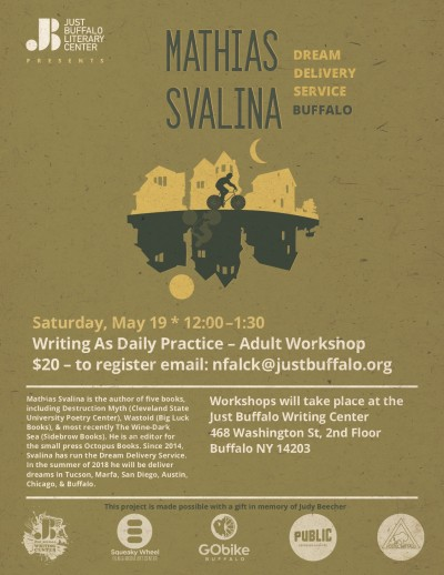 Mathias Svalina is the author of five books, including Destruction Myth (Cleveland State University Poetry Center), Wastoid (Big Lucks Books), and most recently The Wine-Dark Sea (Sidebrow Books). He is an editor for the small press Octopus Books. Since 2014, Svalina has run the Dream Delivery Service in cities such as Tucson, Marfa, San Diego, Austin, & Chicago. During the month of May 2018, he will deliver dream poems in Buffalo, New York.