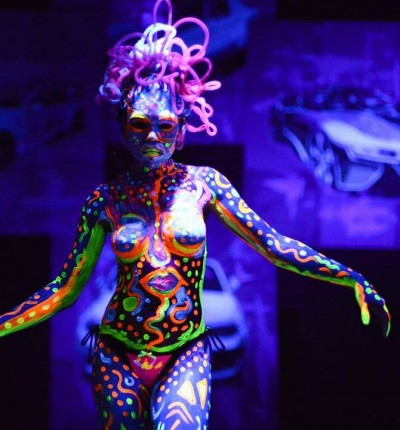 Glamour and Glow is an event that showcases an enormous array of fashion, music, art and horticulture, all illuminated under black lights. Glamour and Glow, a bi-annual event, is performance driven and visually stimulating. Models showcase the hottest designer fashion clothing while displaying glowing body art and theatrical fiber optic hair extensions. The event offers special guest celebrities, DJ’s and visually stimulating circus acts performing wild acrobatic feats. Also showcased are striking 3-D visual props, sculptures and paintings. All guests are encouraged to wear their finest white attire and participate in being body painted.